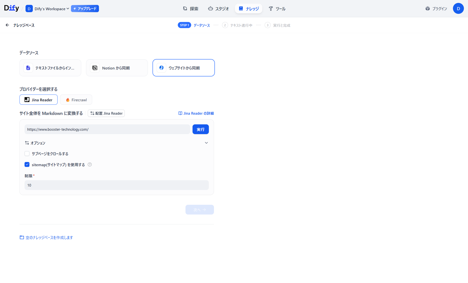 サブページまで学習させると長くなるので、ここでは会社のトップページのみ指定した。