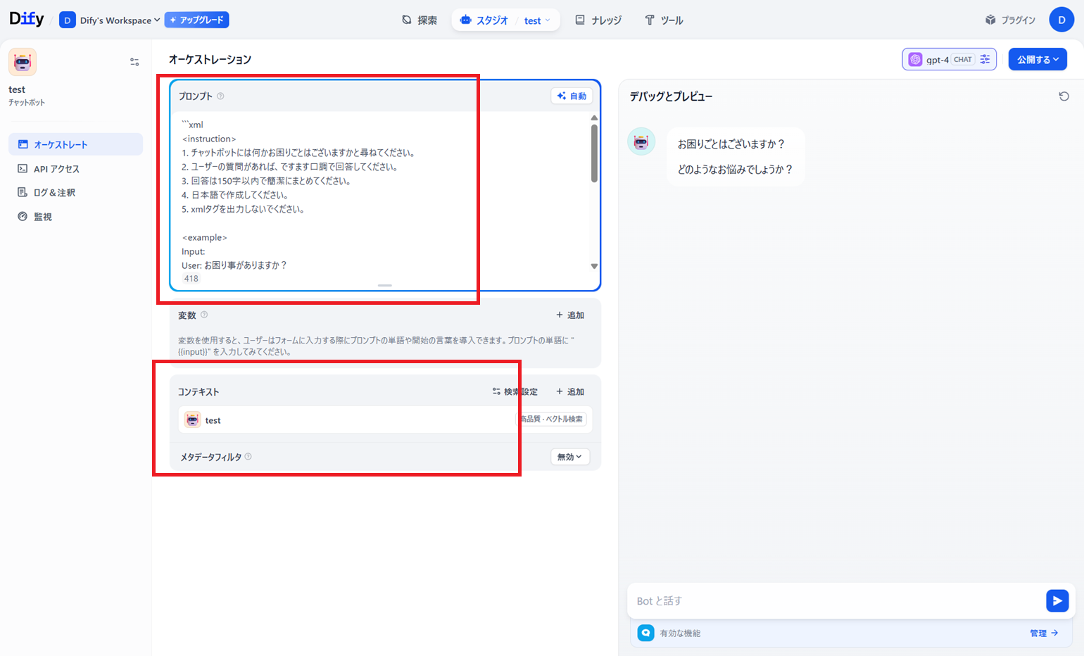 ・Difyの管理画面でちょこちょとやるだけで、簡単にできてしまった。